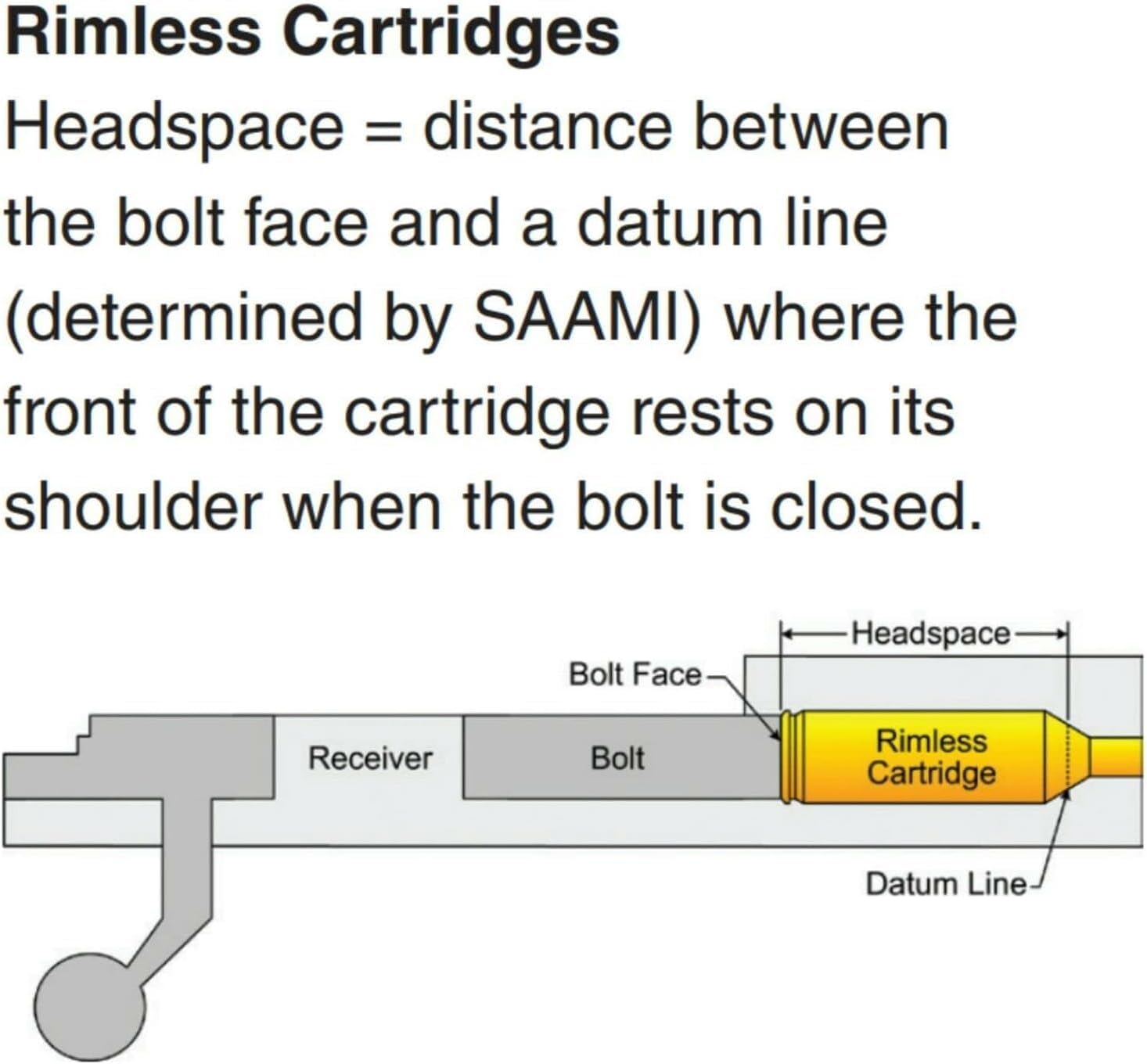 - RIMLESS CARTRIDGE HEADSPACE: The proper use of Headspace Gauges is the most reliable way to test rifle chamber length. Headspace in a rimless cartridge is the distance between the bolt face and a datum line, determined by SAAMI, where the front of the cartridge rests on its shoulder when the bolt is closed.