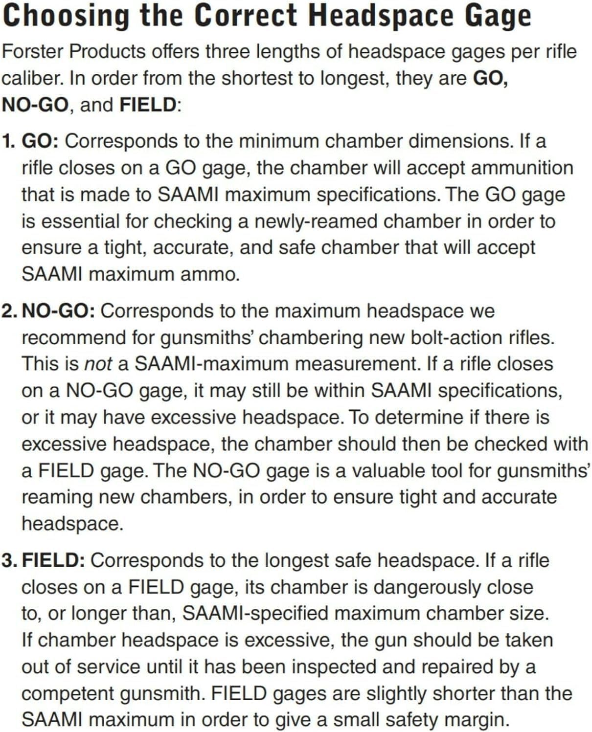 - FIELD: FIELD Gauges are slightly shorter than the SAAMI maximum in order to give a small safety margin. If a rifle closes on a FIELD Gauge, its chamber is dangerously close to, or longer than, SAAMI-specified maximum chamber size. If chamber headspace is excessive, the gun should be taken out of service until it has been inspected and repaired by a competent gunsmith.